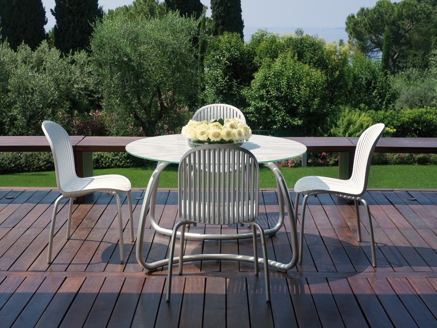 Если постоянно раскладывать и складывать шезлонги и стулья вам неудобно, обратите внимание на садовую мебель из пластика. Не падайте в обморок, представляя себе пластиковые стулья и столы с дырками для зонтов посреди столешницы