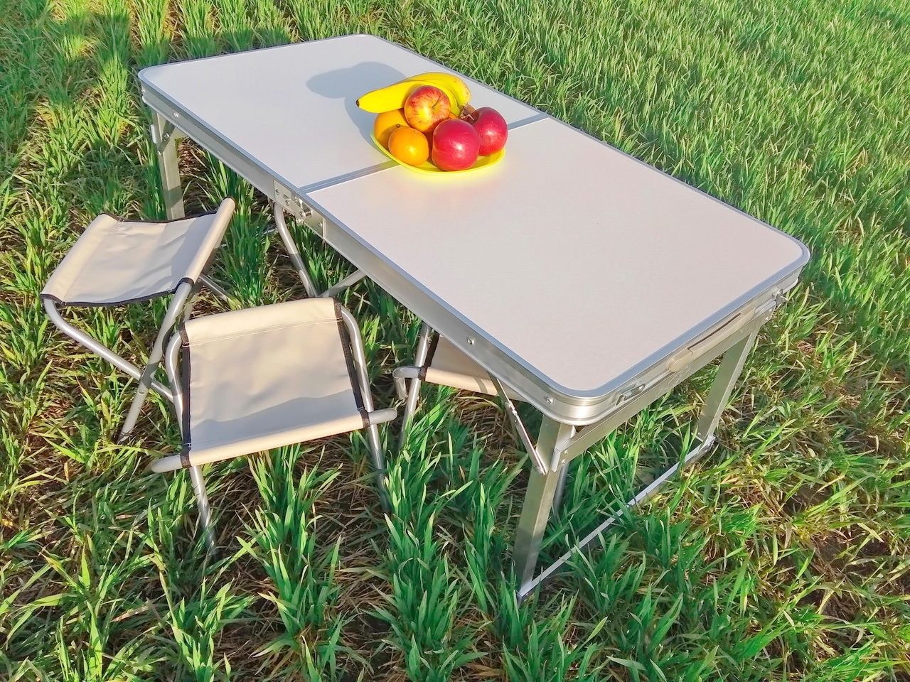 - Стол кемпинговый для пикника — компактная прочная мебель с углами закругленной формы; каркас — из стальных трубок с матовым покрытием, практически невесомый.