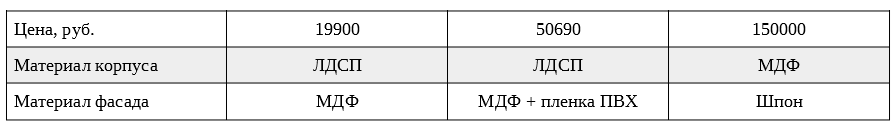 При выборе сравнили 3 варианта кухонь в разной ценовой категории, все прямые и примерно одинаковых габаритов: