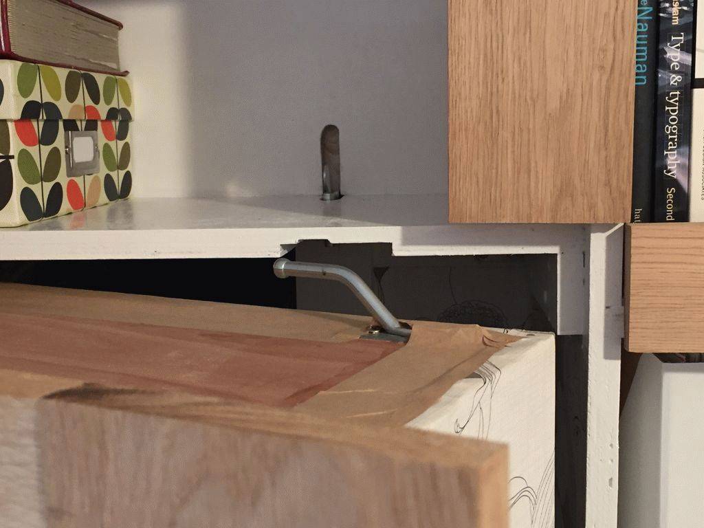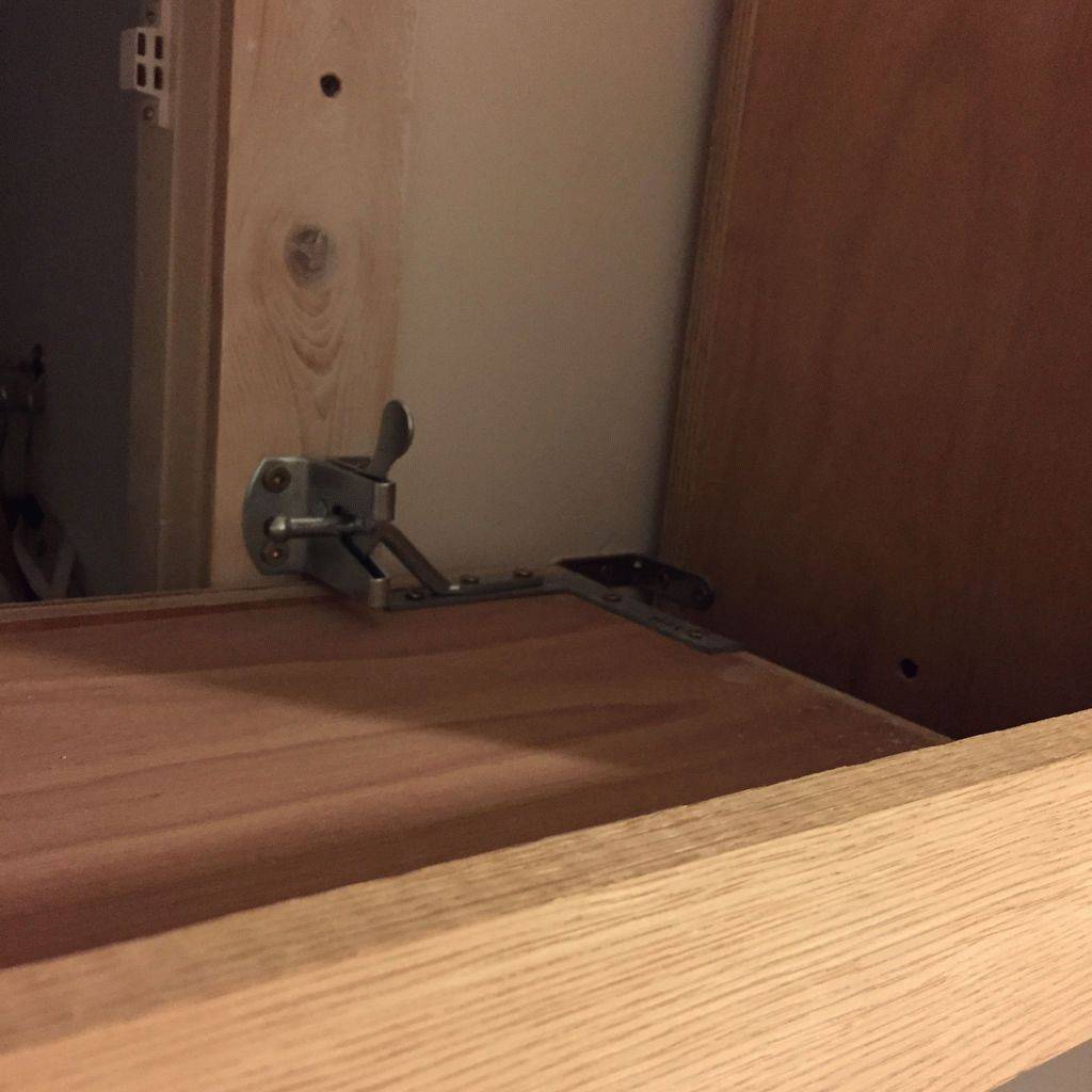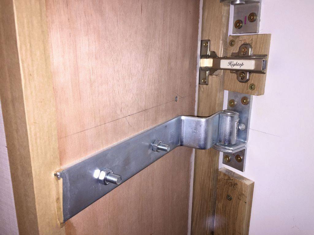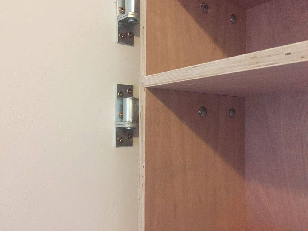 Навешиваем нашу секретную дверь. Учитывая массивность конструкции и вес предметов, которые будут стоять на полках, петли нужно выбирать для тяжелых дверей. Принцип установки потайных дверей не отличается от монтажа обычной.