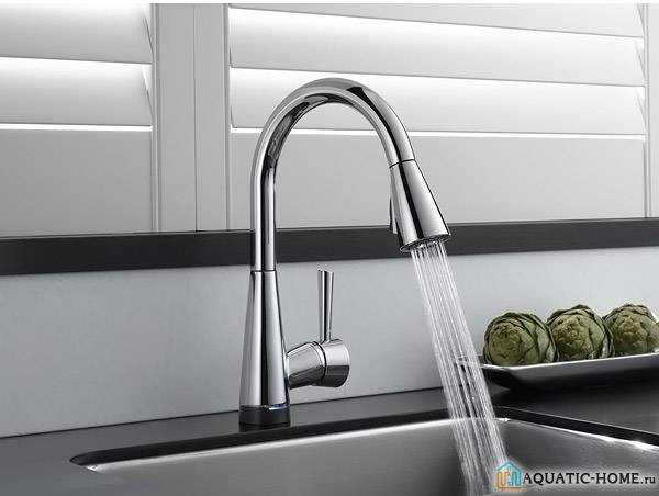 С термостатом — на рынке так же присутствуют и электронные смесители с термостатом. Управляются они через специальный датчик, установленный в корпус самого смесителя или в корпус раковины. Если поднести к нему руку, польется вода той температуры, которую вы установите заранее. Преимущество электронного смесителя очевидны – благодаря термостату он экономнее расходует воду. Минусы: высокая стоимость и необходимость подносить руку к термостату по нескольку раз, чтобы набрать воду в большую кастрюлю.
