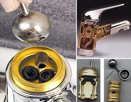 Шаровый механизм смешивания воды работает следующим образом: в шаре имеется несколько отверстий. Поворачивая его, пользователь регулирует количество воды, ее напор и температуру.