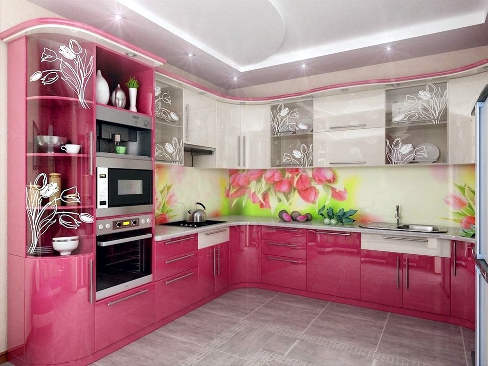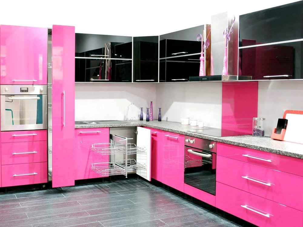 Кухню в розовых красках оформляют не так часто, этот цвет считается девичьим, но ведь нюансов розового множество: от трендового пудрового до фуксии и винно-розового. Это один из самых ненавязчивых и мягких тонов, он улучшает настроение, пробуждает аппетит, снимает агрессию.
