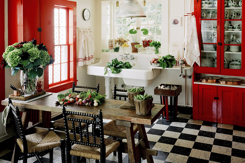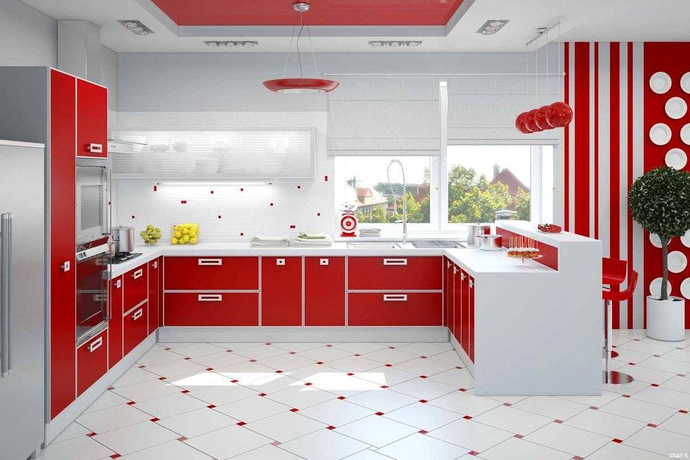 Оттенки красного рекомендуется применять для оформления кухни в стилях ретро, прованс, фьюжн. Если красный цвет использовать грамотно, то он подойдет и для создания классического интерьера. Универсальность данного цвета заключается в том, что его легко сочетать с другими оттенками и разнообразными геометрическими узорами.