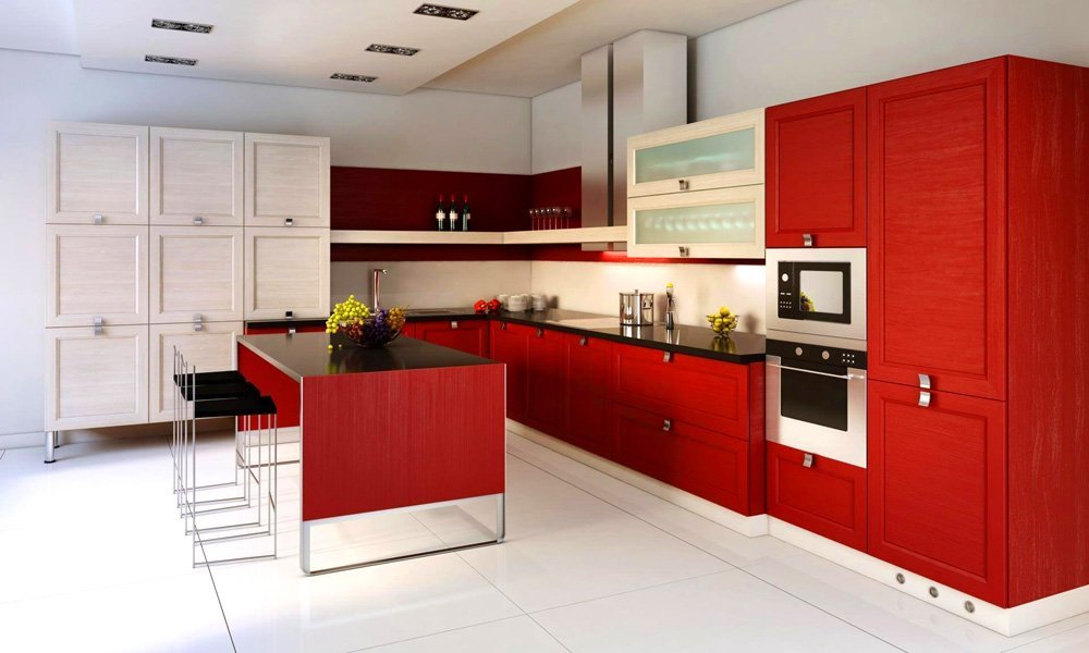 Для помещений небольшого размера красный стоит использовать акцентуально – оформить столешницу, фартук, несколько шкафов. Для больших кухонь актуальны и красные фасады, но их желательно оттенить полками, стеклянными вставками и контрастным фартуком.