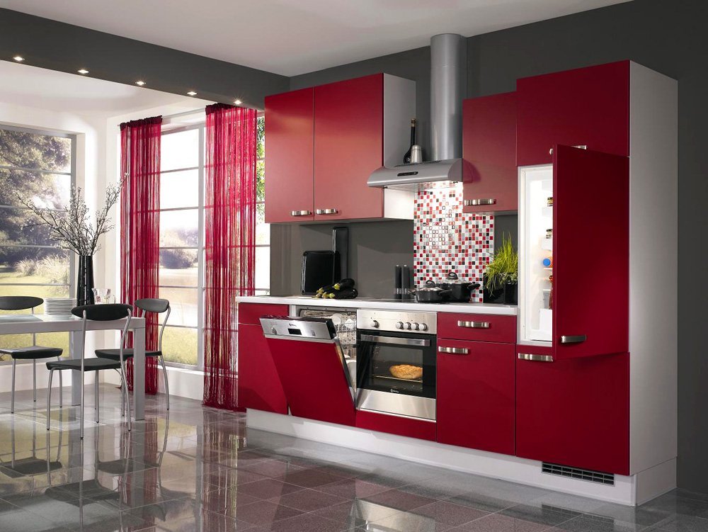 Насыщенные винные и алые тона следует дополнять нейтральными – белый, бежевый, светло-серый, жемчужный вполне подойдет. Отлично сочетаются матовые поверхности фасадов с глянцевыми напольными покрытиями и фартуком.