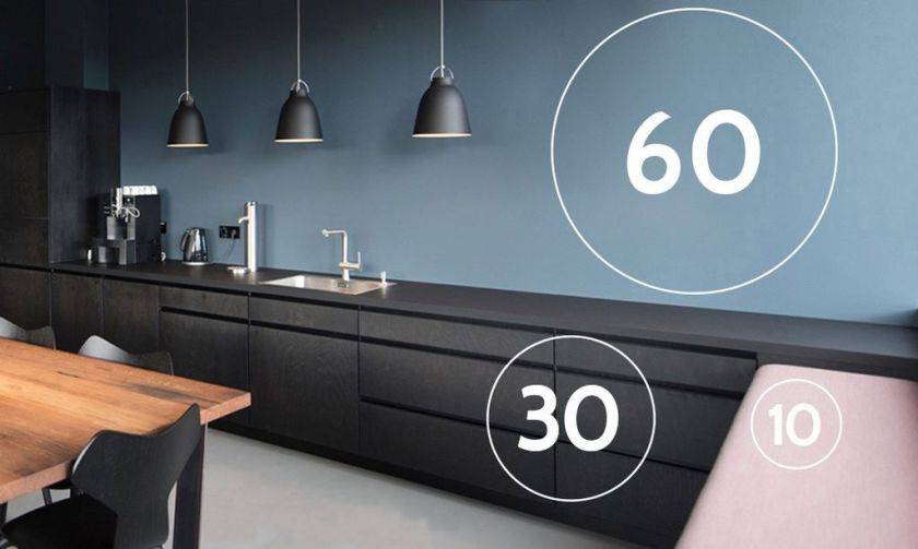 - 60% составляет главный цвет, которым перекрывают большую часть пространства, отдавая предпочтение спокойным тонам.