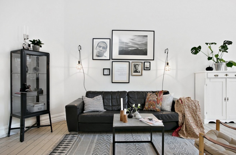 Сам по себе черный цвет может казаться гнетущим и отталкивающим, но если подобрать к дивану удачно перекликающиеся элементы, интерьер станет невероятно привлекательным.