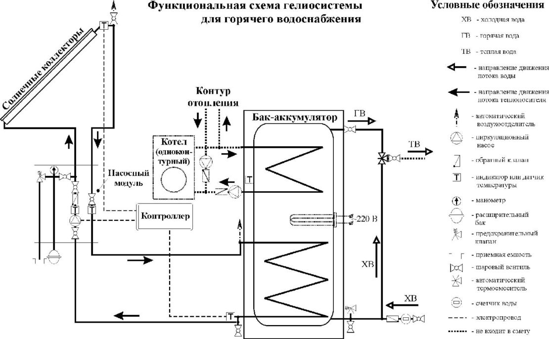 Существует несколько схем подключения гелиосистемы в зависимости от их назначения: