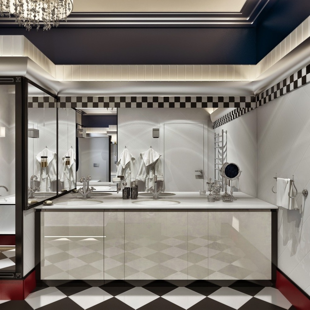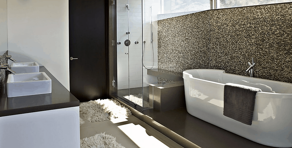 Просторные помещения позволяют расставить мебель так, чтобы не допустить её прямого контакта с влагой. Кроме того концентрация пара в них тоже минимальна, потому и материал для изготовления мебельного гарнитура может быть любым.