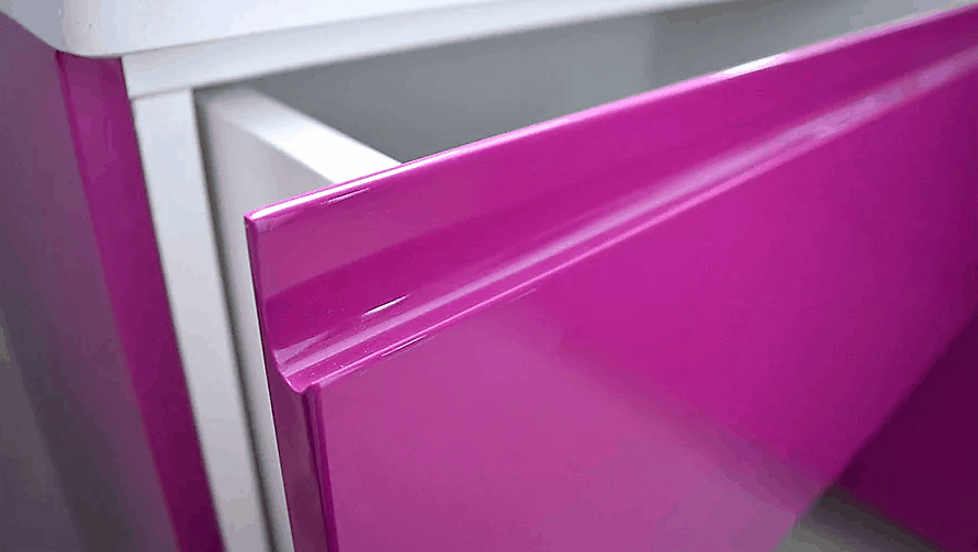 Более долговечным решением будет оклейка фасадов водостойким акриловым листом. Но надо следить за качеством изделий, ведь наличие необработанных стыков приведет к попаданию воды на поверхность МДФ или ДСП с последующим разбуханием основы. Все соединения листов акрила должны быть тщательно обработаны.