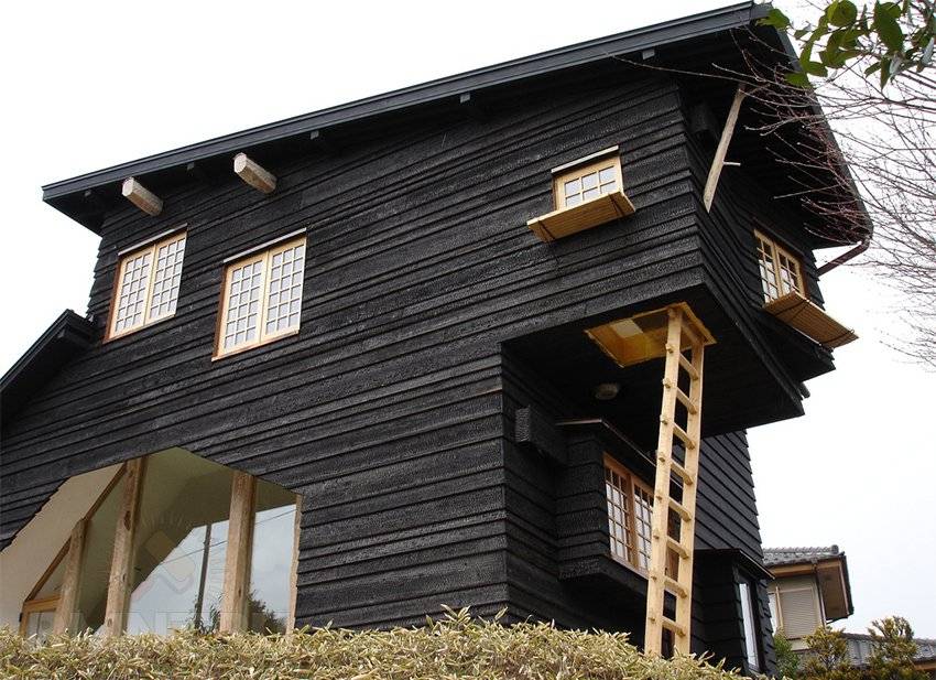 Смелый дизайна вашего фасада легко можно воплотить с помощью обжиг дерева паяльной лампой для получения темных или черных цветов облицовки наружных стен. Применяя эту технологию обработки древесины вы сможете легко сохранить видимость текстуры дерева в отличии от традиционного окрашивания, которое маскирует красоту натурального зерна. Другой недостаток использования покраски древесины заключается в регулярном, повторном применении и краски могут содержать вредные ингредиенты.