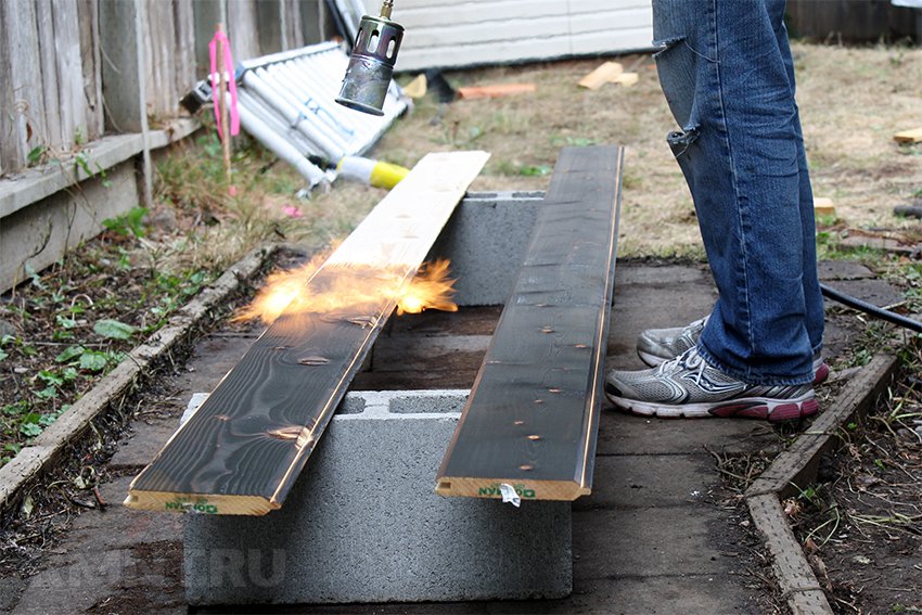 Вариант №1. Поверхностный обжиг. Один из самых часто используемых типов обработки. Он не требует большого времени, специальной подготовки и расходов. Обжиг обычно проводится в домашних условиях с помощью газовой горелки или паяльной лампы. Максимальная глубина обжига составляет около 5 мм.