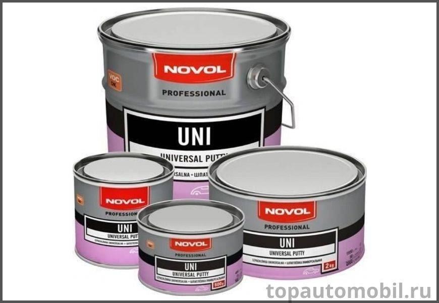 Так как моя практика – ремонт крафтовых автомобилей, я не использую очень дорогие материалы, в основном в магазинах РФ представлена продукция польской компании NOVOL, именно по шпатлевкам этого производителя я вам и расскажу виды полиэфирных шпатлевок и их применение.