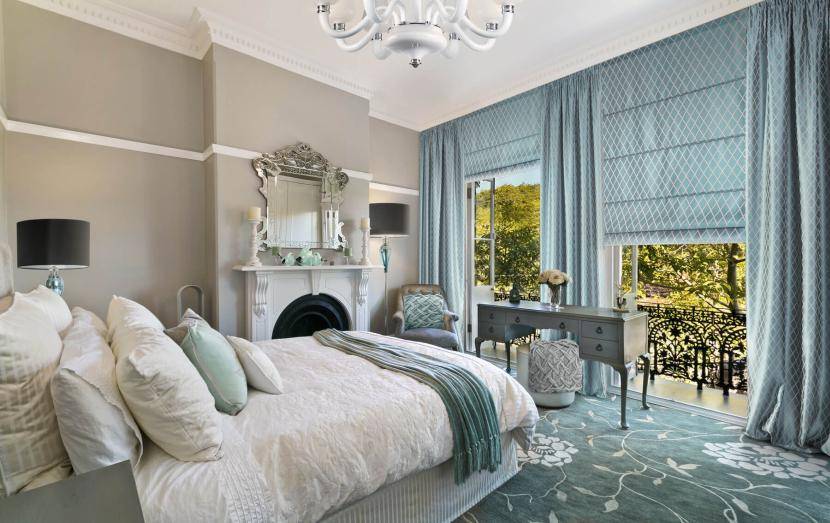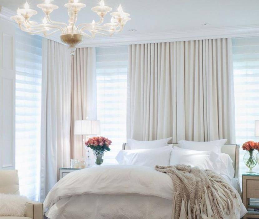 Спальня с подвесными или натяжными потолками. Такая конструкция потолка позволяет сделать оформление лаконичным. Шторы чаще всего фиксируются на двух- и трёхрядных профильных карнизах. Крепление помещается в специальную нишу на потолке и становится незаметным. На обычном потолке крепление можно закрыть потолочным молдингом.