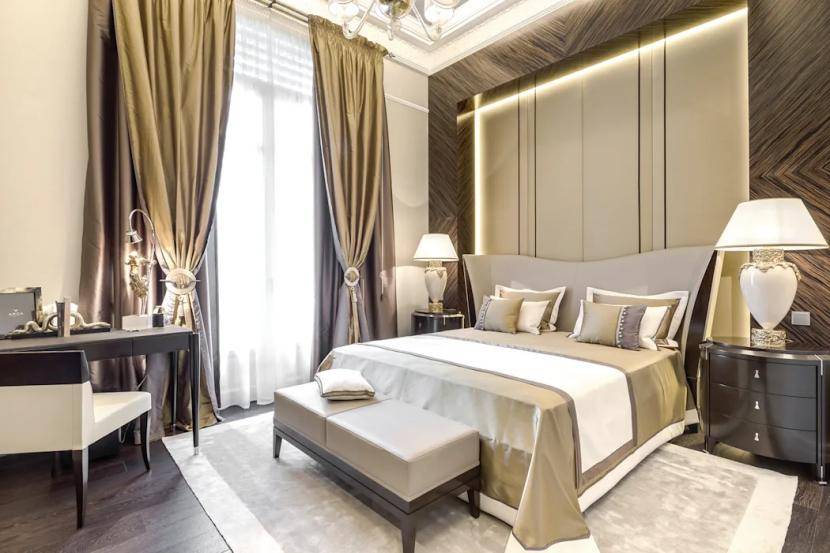 Мы не осознаём, но обычная спальня акцент имеет на окне со шторами, а без окна внимание можно перенести на фальш-камин или красивое изголовье двуспальной кровати. Как упоминали выше, у изголовья можно организовать дополнительное освещение, что акцентирует внимание на этой зоне и украсит интерьер помещения