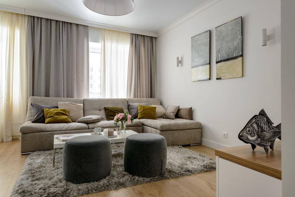Нейтральный интерьер современной гостиной с использованием светло-серого цвета
