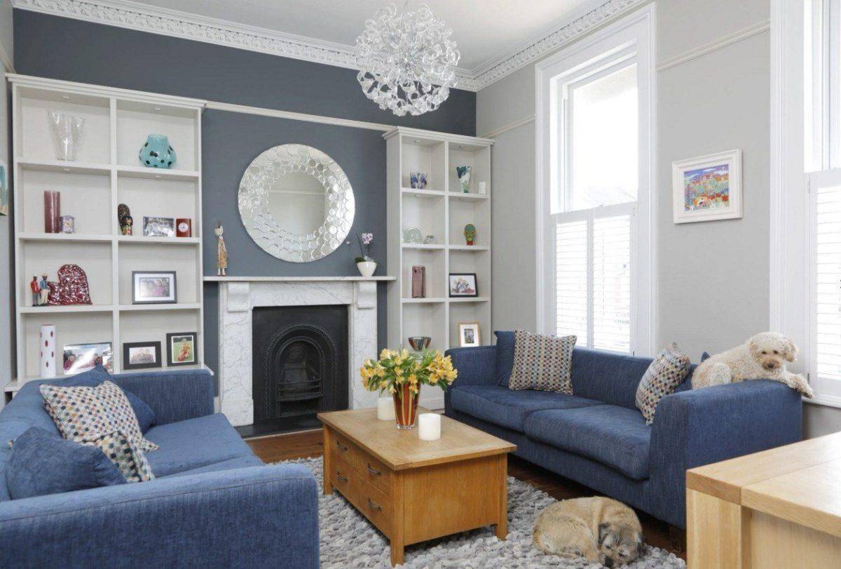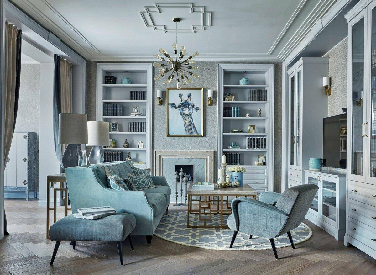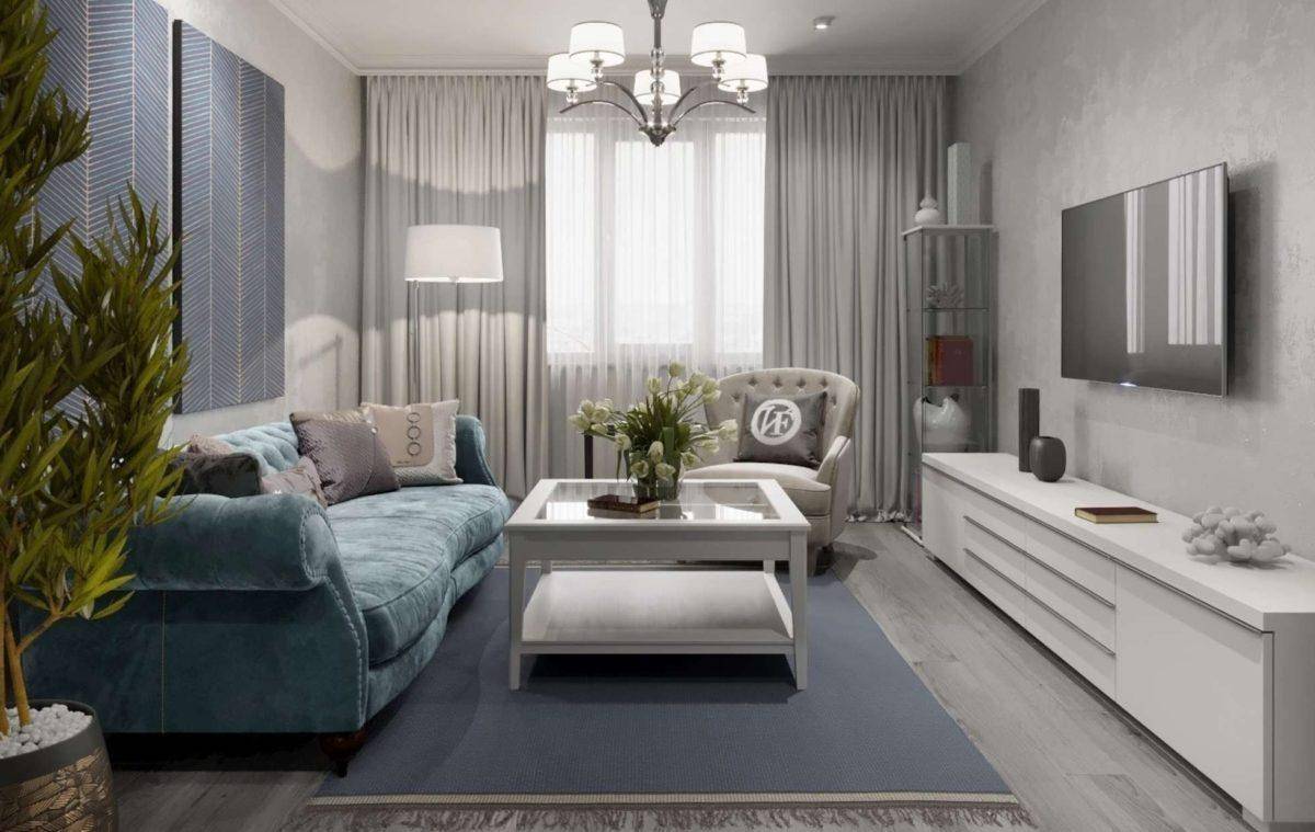 В гостиной преобладает светло-серый цвет, в который окрашены стены, дополненный белым и темно-синим