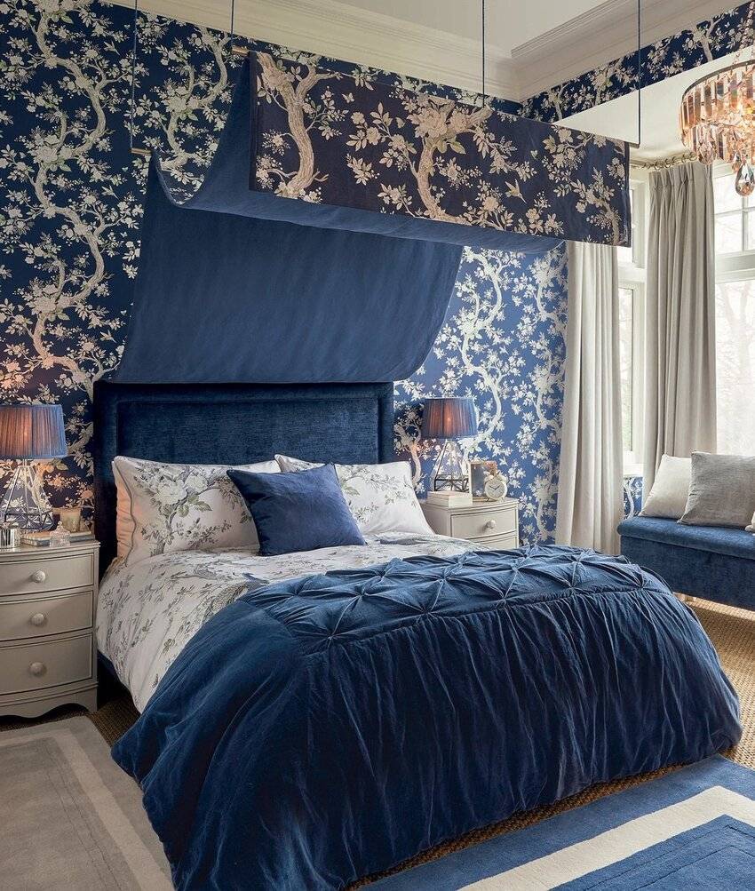 Роскошное сочетание. Его можно дополнить нейтральными оттенками бежевого. Красиво смотрятся сине-золотые узоры (растительные, дамасские, флористические). Мебель выбирайте сложных форм. В такую спальню прекрасно впишутся кровати с массивными коваными изголовьями и мягкие предметы интерьера, оформленные в стиле «каретная стяжка».