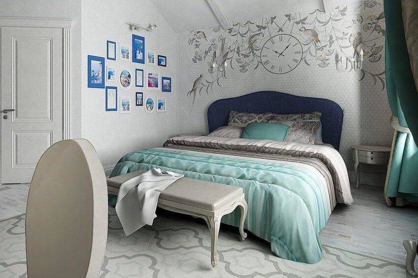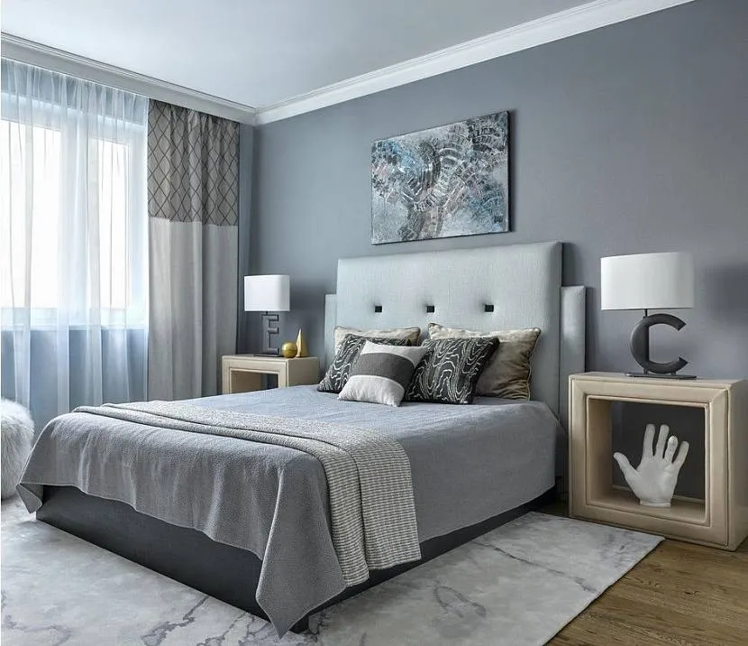Сочетание светло-серого цвета и голубого является классикой для оформления спальной комнаты