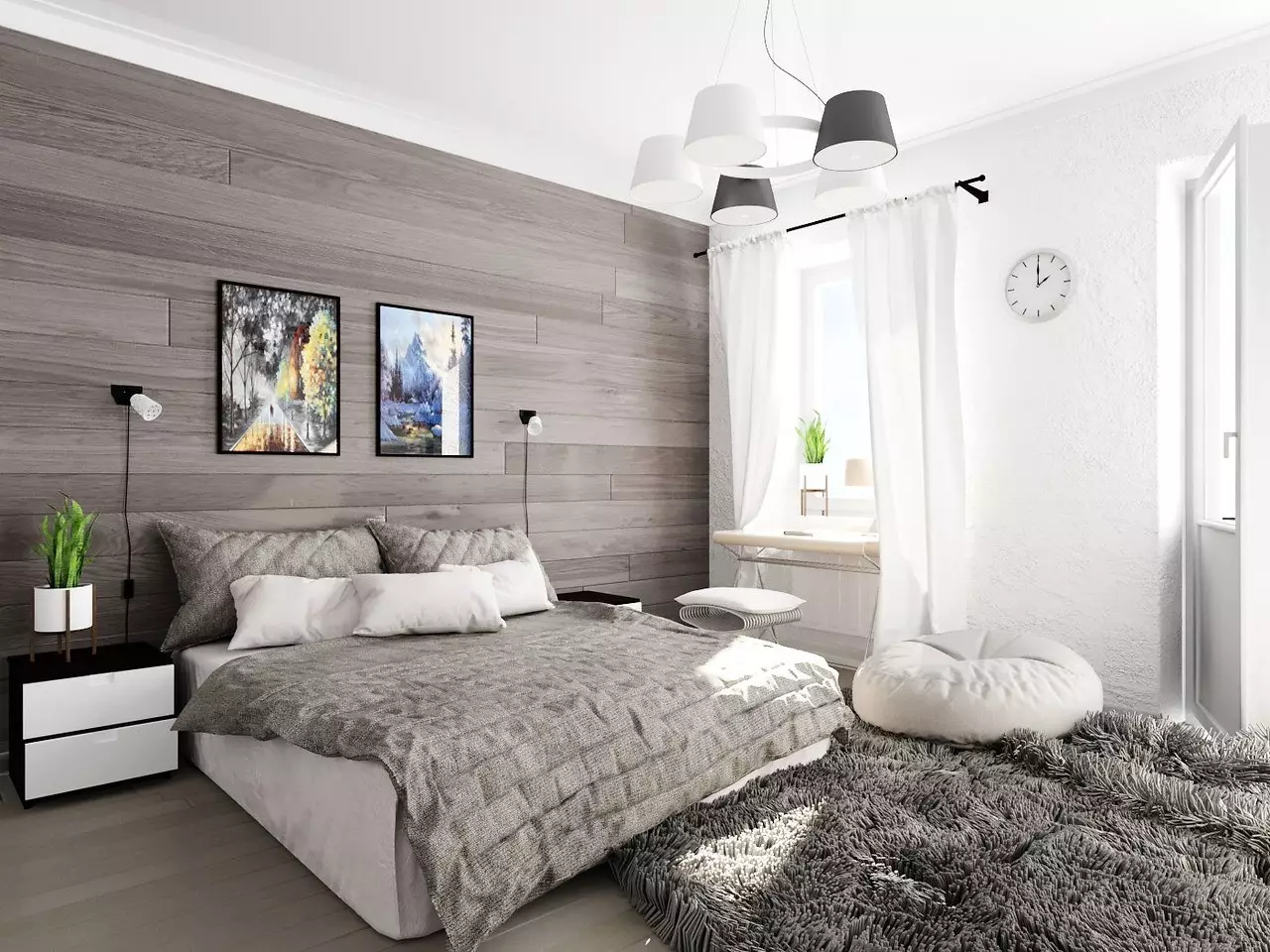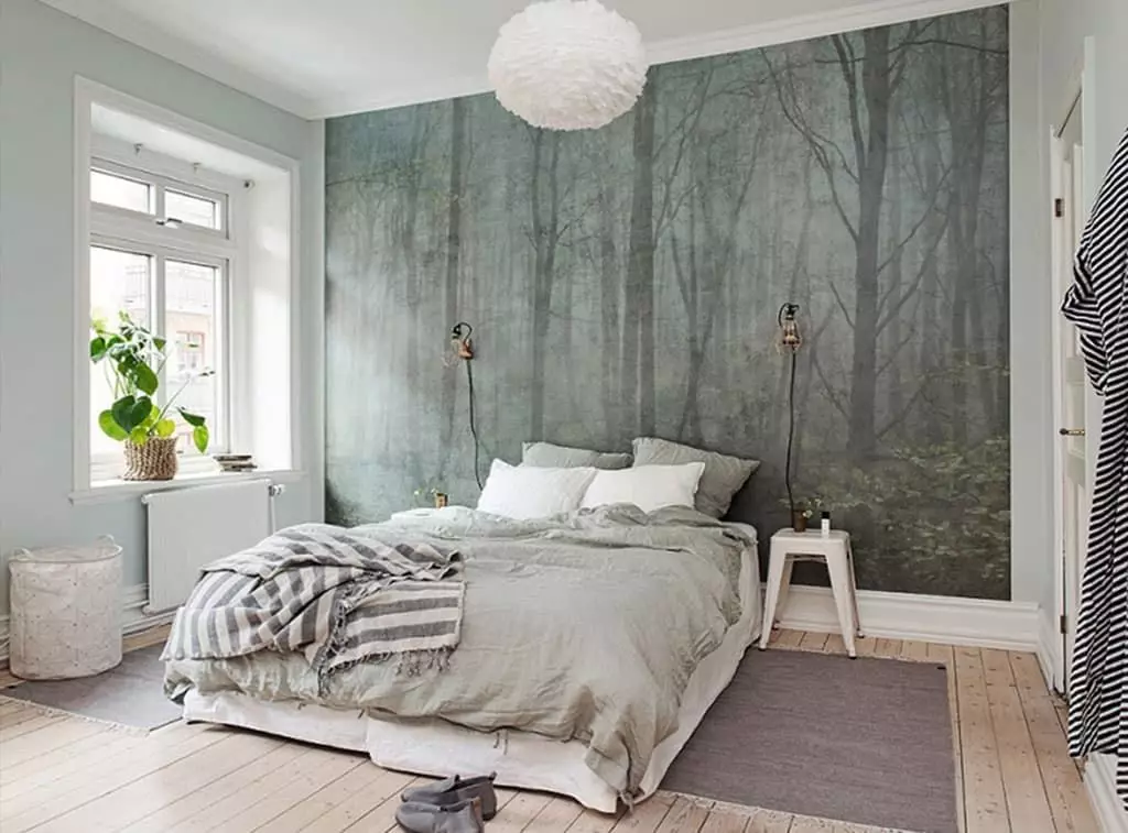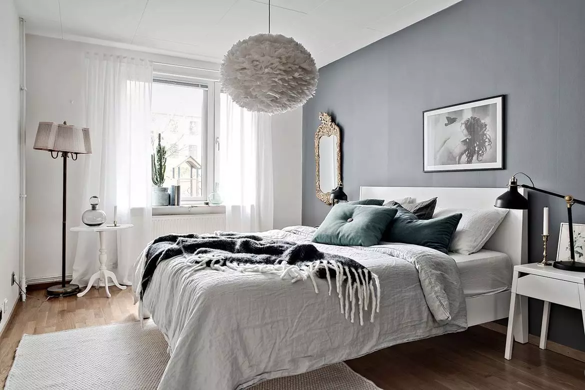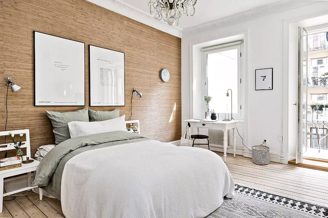Большинство дизайнеров рекомендуют поступить следующим образом – все стены оставить светлыми, а одну сделать акцентной. К примеру, у изголовья кровати или напротив входной двери, но при этом не использовать кричащие геометрические фигуры или узоры. Допускается использоваться контрастных тонов или легкого принта. Также для скандинавского стиля в интерьере спальни идеально впишется имитация природных материалов, а именно выбеленной кирпичной стены, камня и древесина.