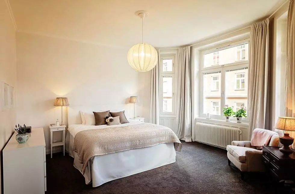 Также для оформления спальни в скандинавском стиле, фото которого предоставлены в статье, часто используется бежевый цвет, который является настоящим воплощением элегантности. Разные оттенки можно использовать для того, чтобы выполнить отделку и напольного покрытия, и для оформления стен, и подбора предметов мебели. Это очень легкий цвет, поэтому лучше не загромождать спальню предметами мебели, а также гардинами темного цвета. Основной целью подобного оформления является подчеркнуть на общем фоне оригинальные акценты, к примеру, золотой тюль, красивые картины и яркое освещение.