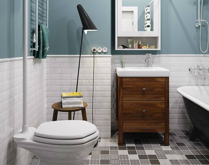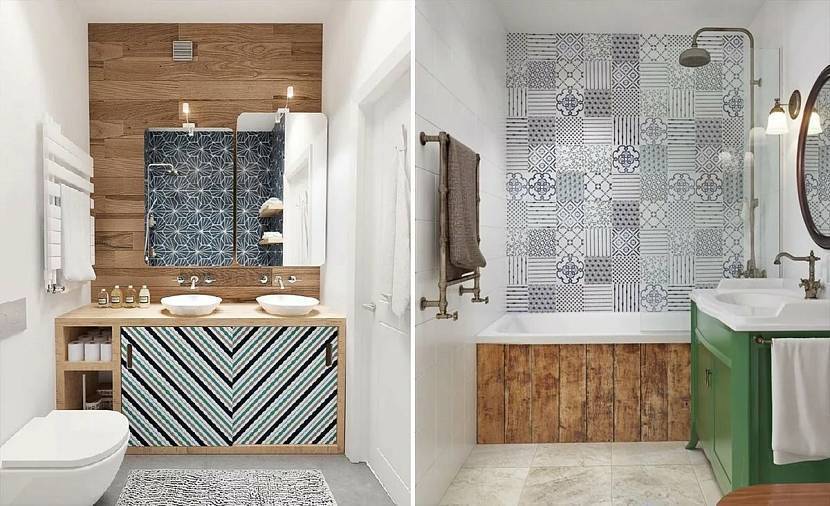 Разноплановая деревянная мебель и натуральный текстиль хорошо гармонируют с узорчатой плиткой на стене, полом и потолкомИсточник ikea.com