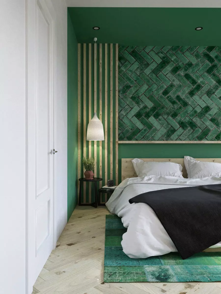 Иногда встречается оформление спальни в зеленом цвете, но тут стоит помнить о том, что далеко не все тона подойдут для скандинавского стиля. Идеальным вариантом будет использовать оливкового оттенка, а также отделку цвета молодой травы. Такая гамма поможет наполнить комнату свежестью, покоем, а также будет положительно влиять на нервную систему человека.