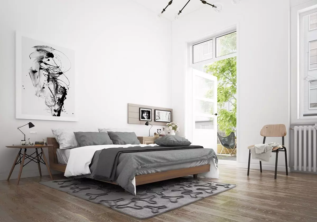 За счет преобладающей светлой палитры, скандинавская стилистика идеально вписывается в малогабаритную спальню.