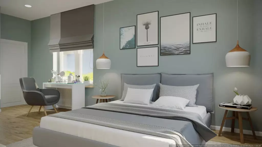 Натуральный оливковый цвет способен превратить вашу спальню в настоящее царство релакса и спокойствия. Психологи утверждают, что именно этот оттенок чудесно подходит для спальни, поскольку способен положительно воздействовать на нервную систему. Зеленый наполняет комнату свежестью. Но надо учитывать тот факт, что мятные тона обладают способностью поглощать солнечные лучи, поэтому не нужно использовать их в изобилии. Самые красивые сочетания – зелено-лимонный, мятно-бирюзовый и бело-зеленый.