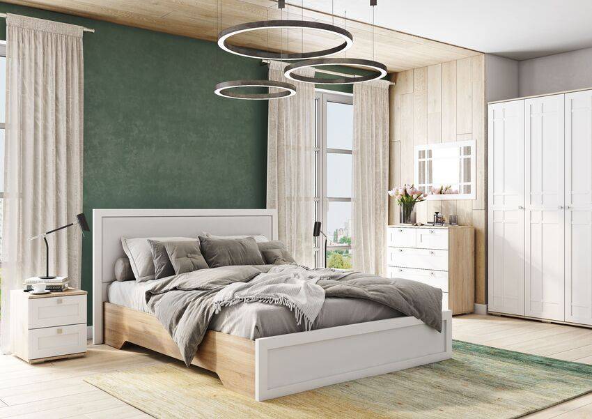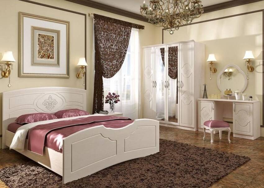Они представляют собой полный комплект из кровати, шкафа и сопутствующей мебели, например, прикроватные тумбы, туалетный столик, комод и пр.