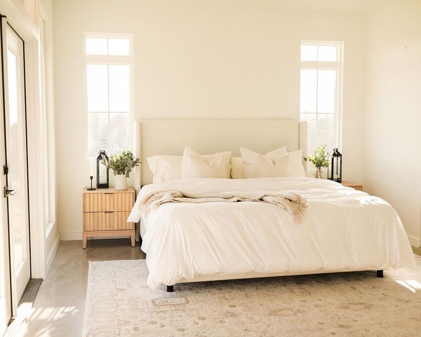 Отдавайте предпочтение однотонной отделке и мебели: спокойная нейтральная палитра цветов – идеальное решение для спальни в современном стиле.