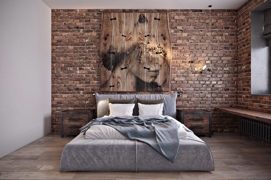 За интерьер этой спальни обидней всего — кто-то ну очень хотел сделать его стильным. Штукатурка под бетонные блоки, коньячное дерево, ковёр из, внезапно, коровы и 6(шесть!) отдельных светильников. Этого хватило бы на 2-3 стильных спальни, ну или на одну безвкусную. Попытка вместить всё это на такой маленькой площади была просто обречена на провал. Эта спальня пыталась. Читайте как правильно делать дизайн маленькой спальни.