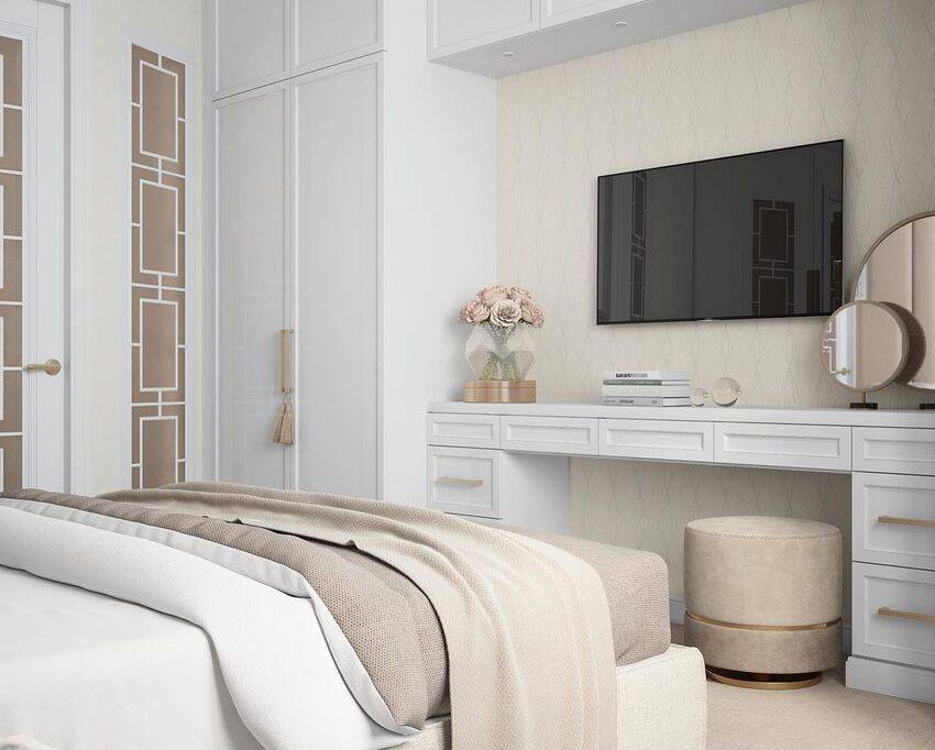 Для современной спальни лучше приобрести встроенную модель шкафа, в идеале купейную. Такая мебель отличается повышенной вместимостью. Дверки будут открываться без помех. Шкаф можно декорировать в той же цветовой гамме, что и стеновые поверхности или при помощи зеркал.