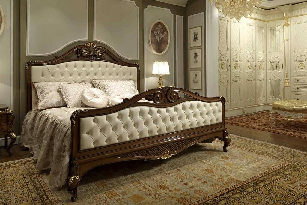Поэтому приветствуется обивка кожей, бархатом или шелком. Нередко можно увидеть металлическую конструкцию с богатой кованой спинкой. Причем дополнительное изящество могут придать бронзовые или позолоченные элементы. А если изголовье деревянное, то ажурная резьба.