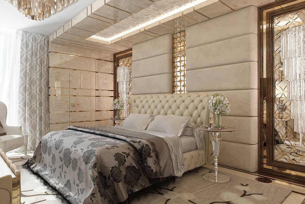 Здесь есть всё: и комфортная дневная зона отдыха, и уютная кровать с мягким изголовьем. Пространство спальни визуально увеличивают теплые бежевые оттенки, а роскошная люстра и золотое обрамление потолка подчёркивают атмосферу стиля арт-деко.