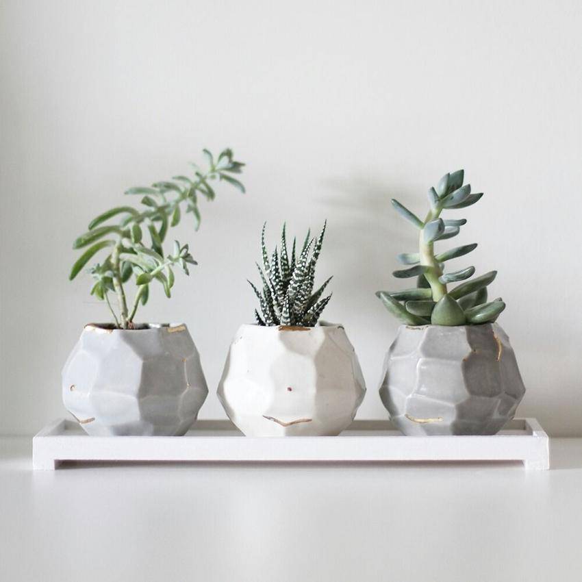 Отличным решением, оживляющим пространство спальни, будет размещение на полке, тумбочке, на окне или в нише нескольких суккулентов в маленьких, но оригинальной формы горшках.