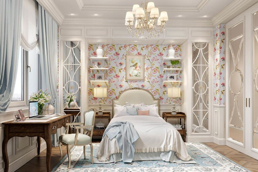 Лёгкую и немного кокетливую атмосферу поддержат зеркала в красивых рамах и конечно, цветы – пусть они присутствуют и в узорах на ткани, и в виде букетов на прикроватной тумбе.