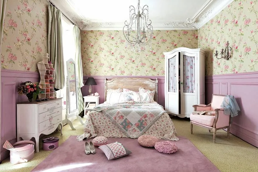 Оклеенные обоями стены должны создавать атмосферу старины, роскошной и наивной одновременно, поэтому милые рисунки, природные фактуры и состаренные участки будут смотреться очень романтично, добавляя характерного колорита обстановке.