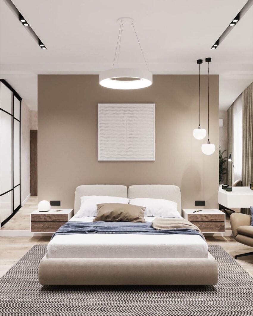 На фото современная спальня в приглушенных цветах