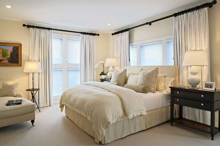 Спальня в светлом стиле допускает шторы с разной ткани.