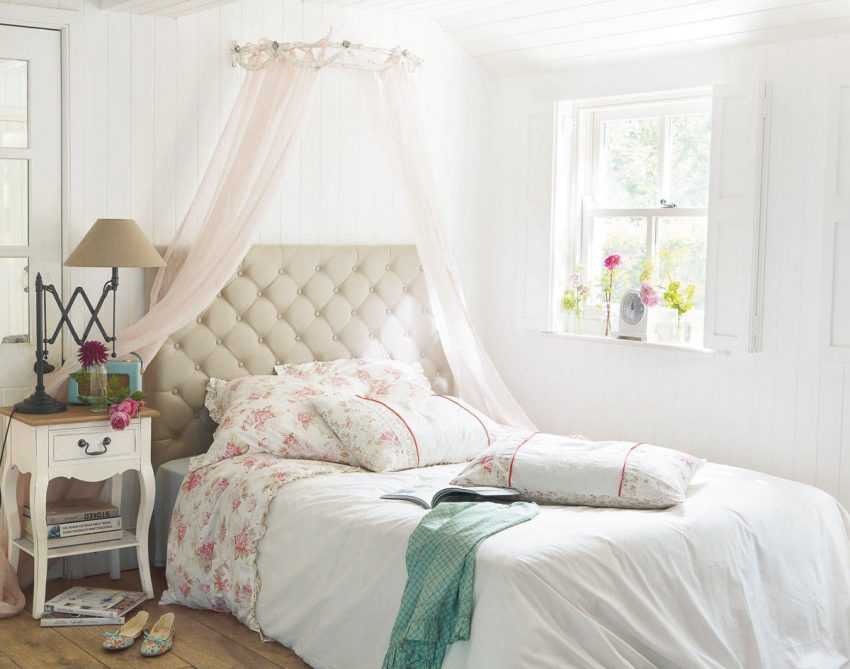 Прованс идеален для загородных домов, в особенности, выполненных из бруса, хотя при желании такую спальню можно организовать и в квартире. Важные нотки стиля – элегантность, романтика, пастельные тона, обилие флористических мотивов и винтажные элементы.