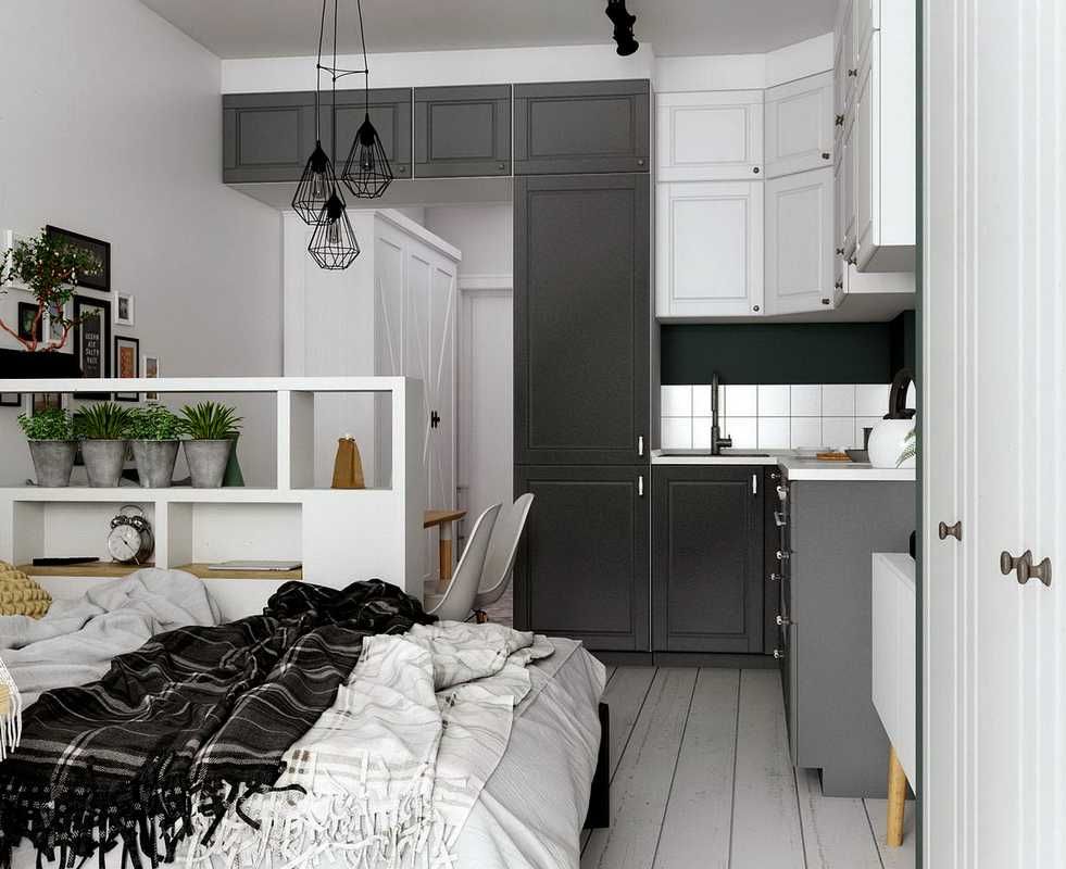 Если квартира очень маленькая, то и выбор планировки небольшой. В некоторых случаях дизайнер вынужден размещать кухню и спальное место рядом, не применяя сложных методов зонирования.