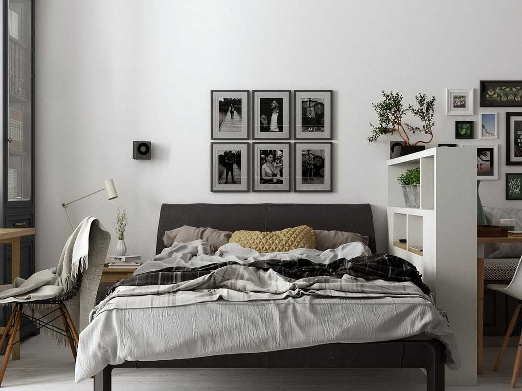 Кровать просто установлена рядом с кухонным гарнитуром и обеденным столом. Её отделяет низкий стеллаж, подчёркивающий границу между зонами. Возводить в этой комнатке специальную перегородку не рационально. Общий стиль оформления всей комнаты единый: нейтральные серые цвета мебели и белые стены.