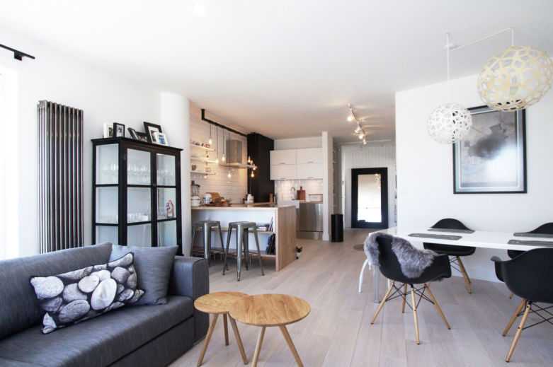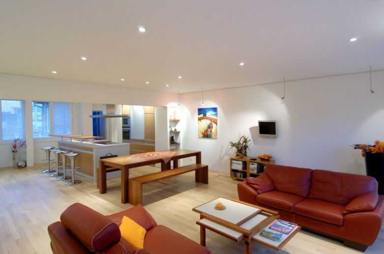 Объединенное помещение необходимо обустраивать более мощной вытяжкой и выбирать бесшумные бытовые приборы.