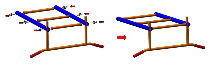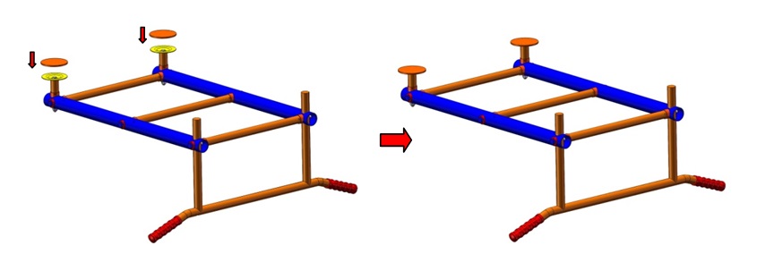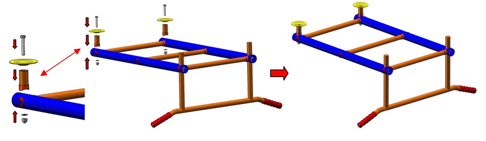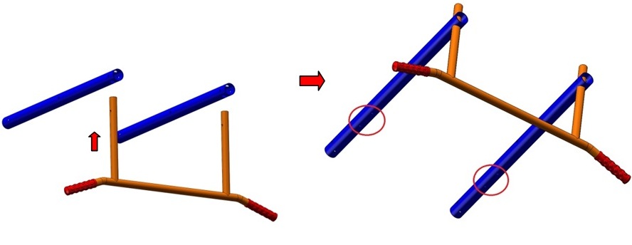 Вставьте турник в отверстия O26 мм (обратите внимание, что на раме отверстия O6 мм с резьбой должны быть с той стороны, где и ручки турника – выделено красным цветом):