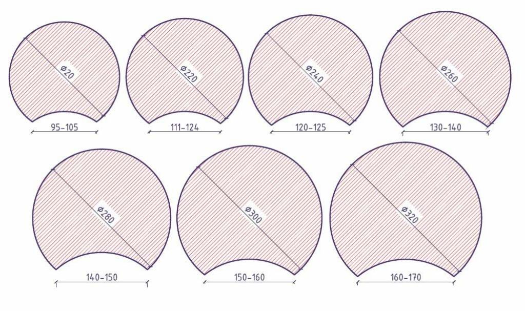 | Характеристика оцилиндрованного бревна | Ширина венцового паза В=0,5*D (1/2D) | Ширина венцового паза В=0,6*D (3/5D) | Ширина венцового паза В=0,67*D (2/3D) | ||||||