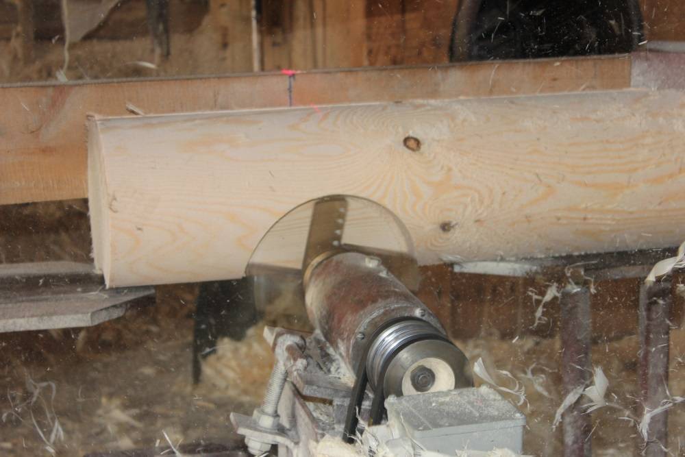 Бревна разделяют на части при помощи торцовочного станка. Проводят зарезание пазов и шипов на торцах для сращивания по длине или для установки оконных и дверных проемов. После этого происходит нарезка чашек под подготовленный проект деревянного дома или бани. Нарезку делают при помощи лазерной разметки и высокоточного оборудования.