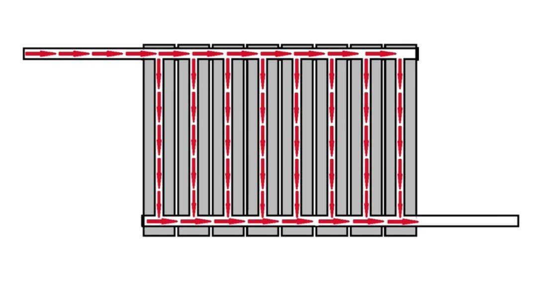 Батарея изготовлена из двух металлов – стали и алюминия. Основой радиатора является горизонтальные вводные и выводные стальные трубки с поперечными трубчатыми каналами, окружённые конверторными алюминиевыми пластинами.