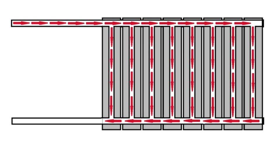 Конструкция панельных радиаторов такова, что они изготавливаются из двух штампованных листов стали, соединенных вместе, внутри которых находятся 2 горизонтальных канала вверху и внизу и по 3 вертикальных на каждые 10 см длины.